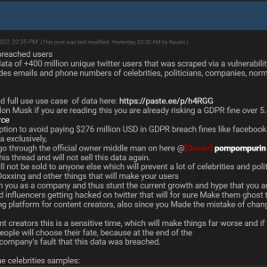 “Twitter or Elon Musk if you are reading this you are already risking a GDPR fine over 5.4m breach imaging the fine of 400m users breach source. Your best option to avoid paying $276 million USD in GDPR breach fines like facebook did (due to 533m users being scraped) is to buy this data exclusively.” reads the advertising.