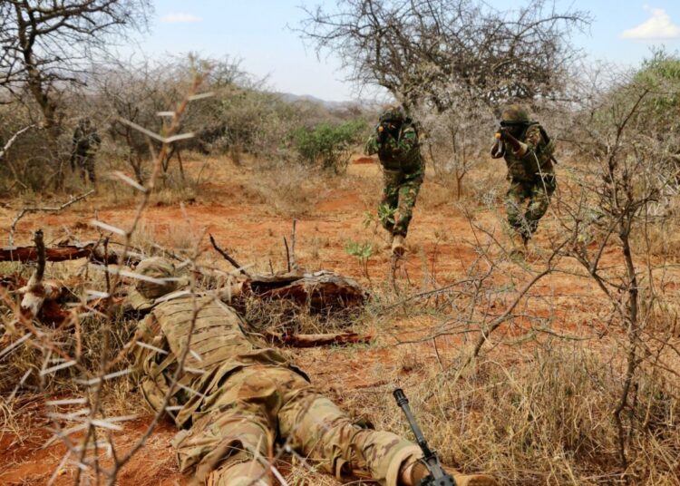 U.S. Army Soldier, Spc Joseph Martinez from 1st Battalion, 503rd Infantry Regiment, 173rd Airborne Brigade, takes fire during a force on force field training exercise with Kenyan Defence Force Soldiers during the final exercise of Justified Accord, March 16, 2022. Exercise Justified Accord allows the US and our African partners to support enduring peace and stability in the region. Over 800 personnel participated in the exercise which included a multinational field training exercise and a command post exercise Feb. 28-March 17, 2021.