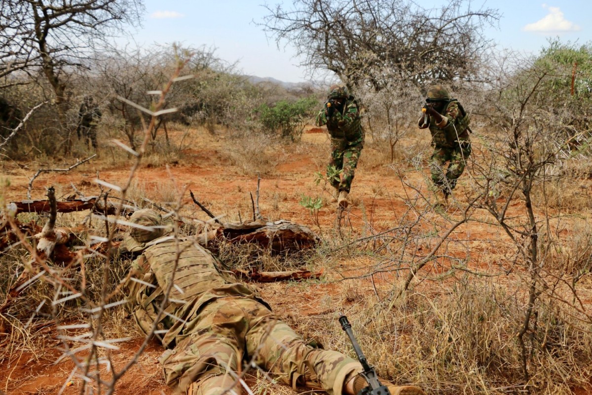 U.S. Army Soldier, Spc Joseph Martinez from 1st Battalion, 503rd Infantry Regiment, 173rd Airborne Brigade, takes fire during a force on force field training exercise with Kenyan Defence Force Soldiers during the final exercise of Justified Accord, March 16, 2022. Exercise Justified Accord allows the US and our African partners to support enduring peace and stability in the region. Over 800 personnel participated in the exercise which included a multinational field training exercise and a command post exercise Feb. 28-March 17, 2021.