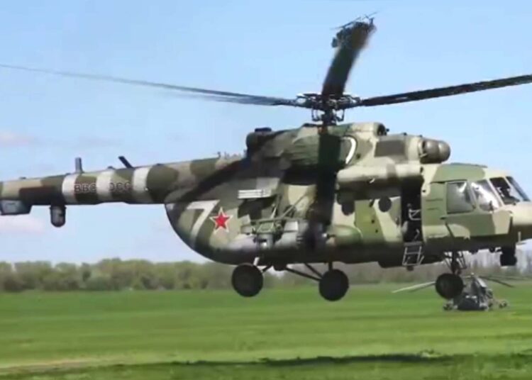 The images were obtained from the Russian Ministry of Defense (MoD) on Monday, along with a short statement claiming that the images show “the work of the crews of Mi-8 helicopters with modern electronic warfare systems installed on board,” with “servicemen using the modern electronic warfare systems at maximum altitude.”