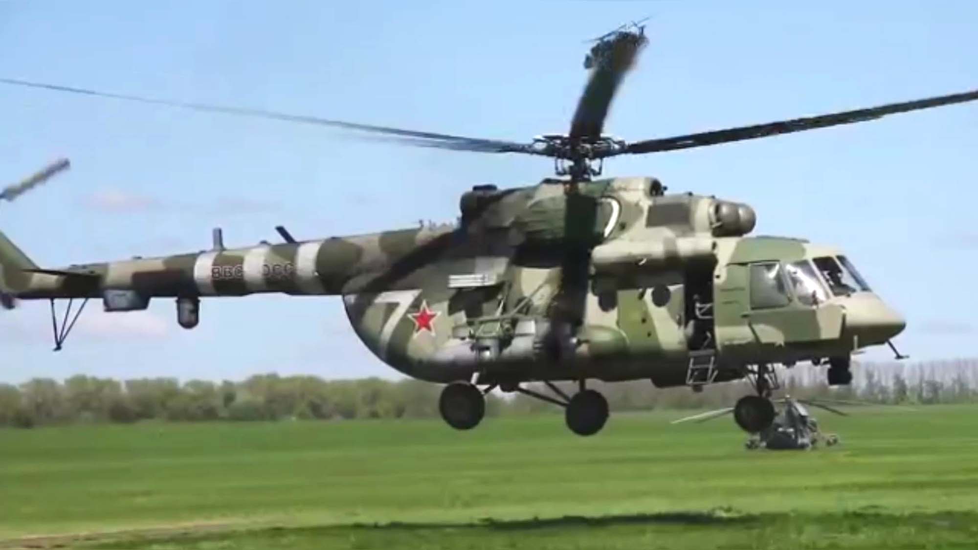 A pair of Russian Mi-8 attack helicopters take to the sky in the video before they are seen traveling close to the ground over the countryside somewhere in Ukraine. They then appear to be at a higher altitude, just above the clouds, before they are again seen lower in the sky as they come in to land, as these images show.