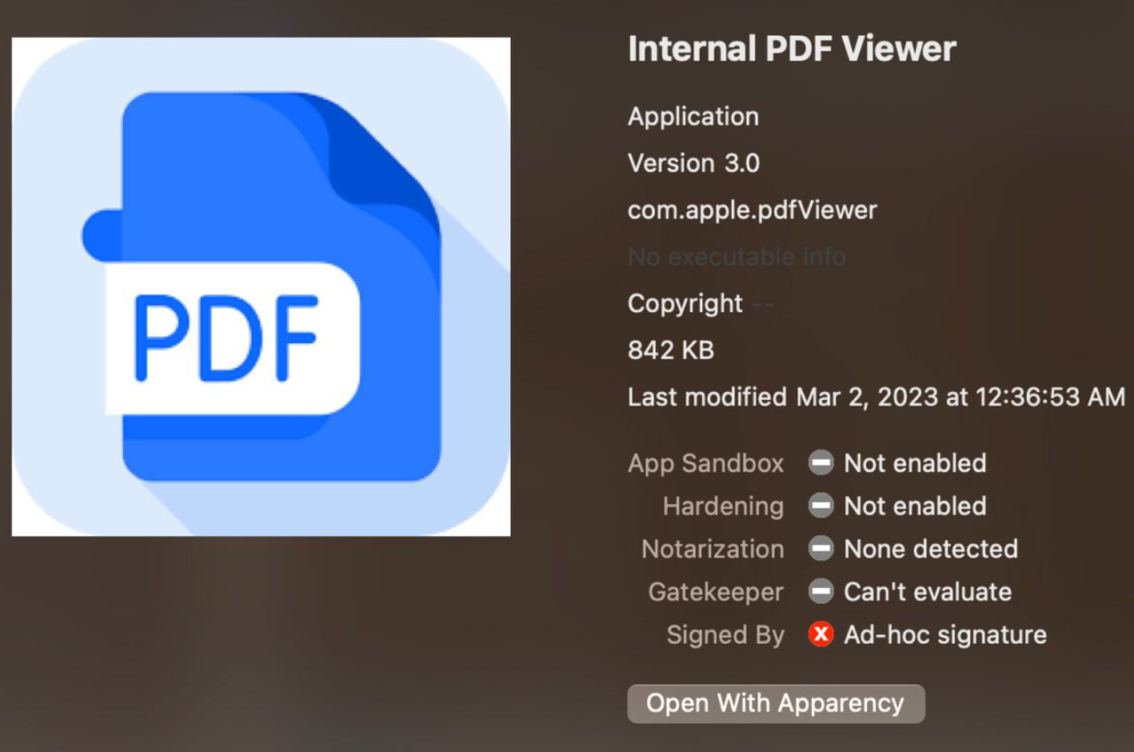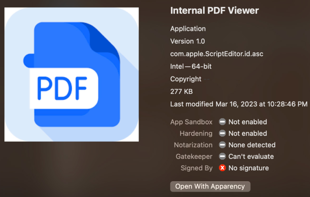 The application functions as a PDF viewer, made possible by utilizing Apple’s proficient PDFKit Framework. The application has performed no malicious actions as of yet upon its execution.