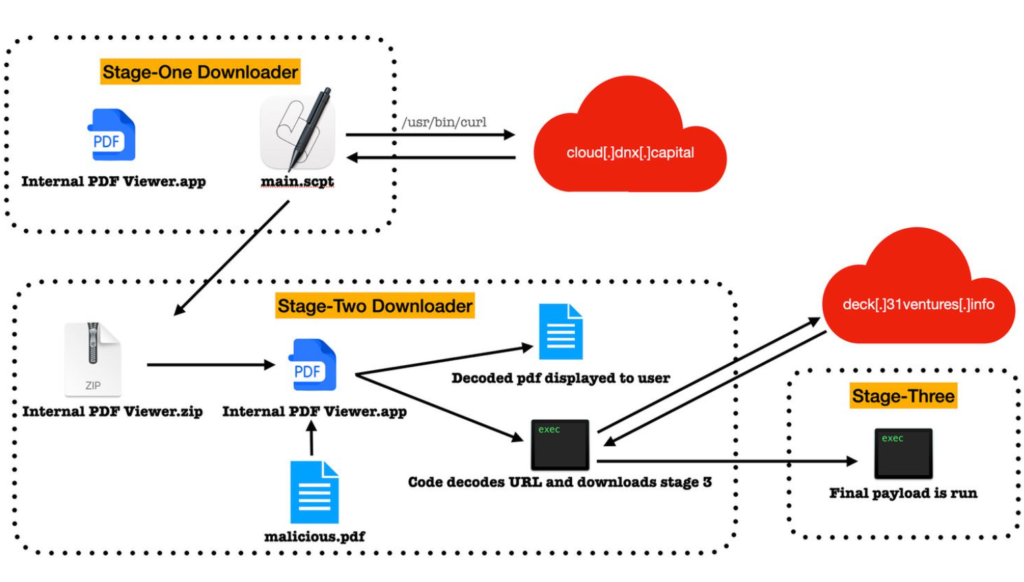 Jamf detected a nine-page PDF document that claims to provide an “investment strategy.” Once opened, it connects to a C2 server to fetch and execute a third-stage trojan.