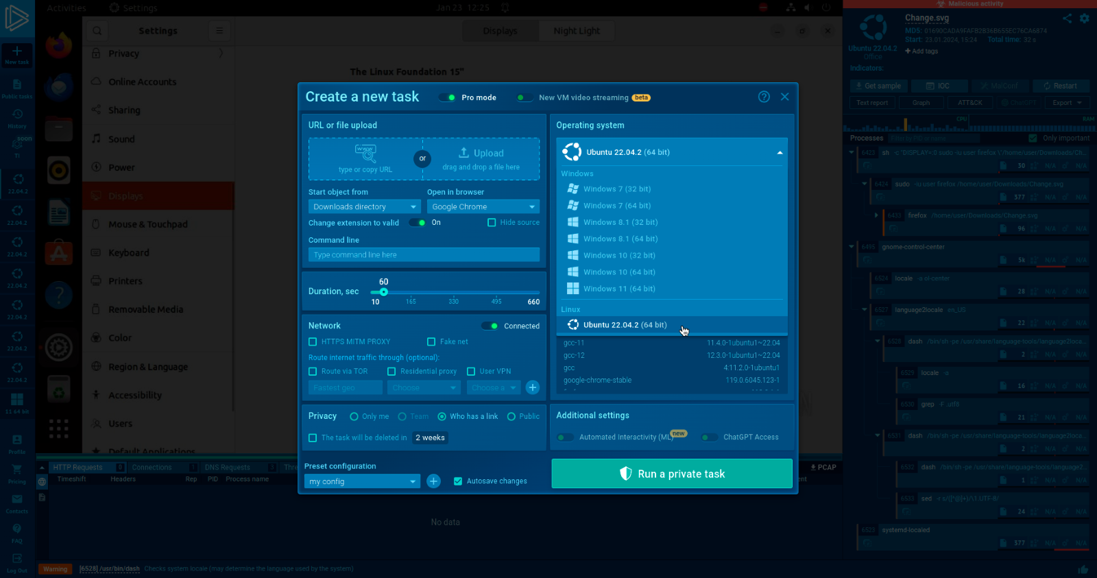 According to the ANY.RUN report, If you choose this option, the sample will run on Ubuntu. It’s worth noting that Ubuntu 22.04.2 will be supported upon launch and all ANY.RUN users, regardless of their plan, will have access to Linux.