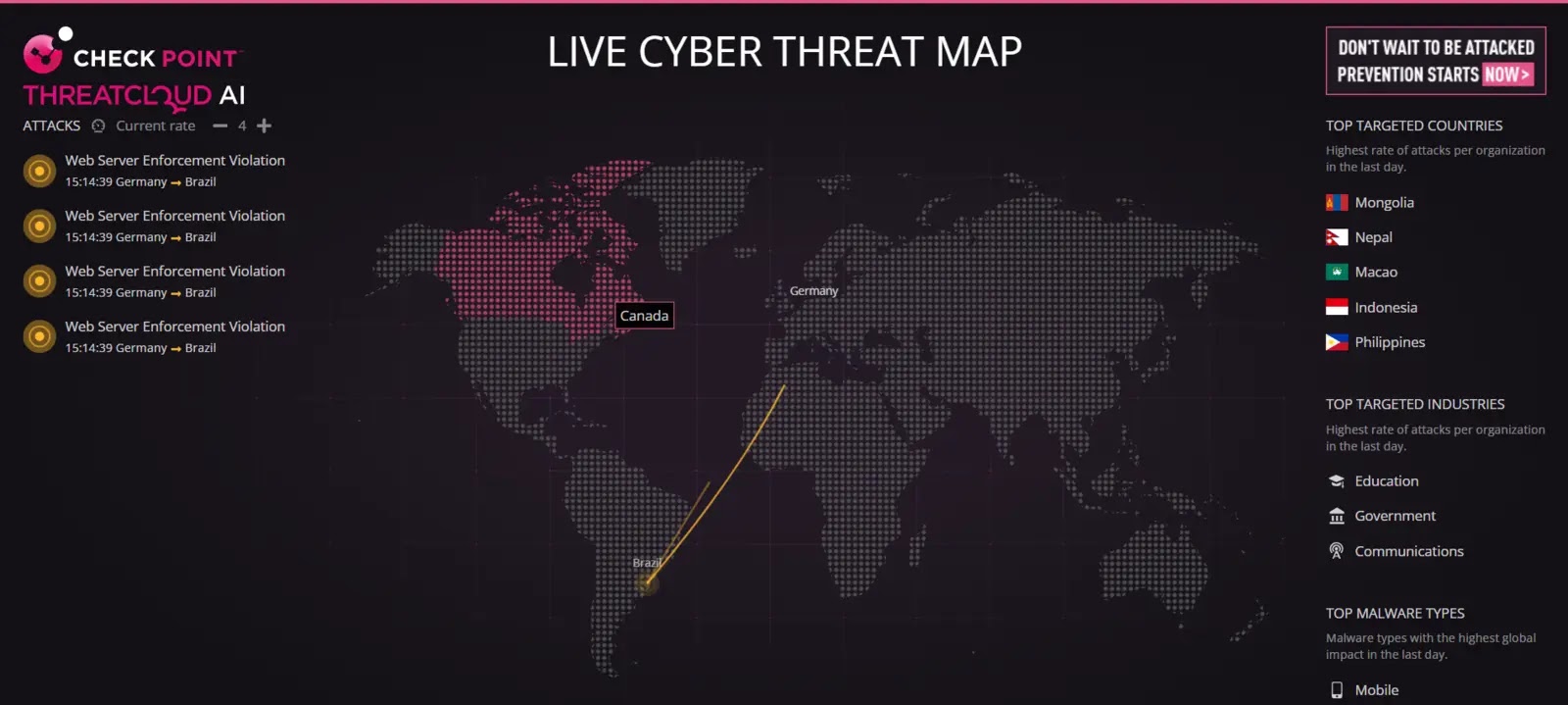 Here we have the Checkpoint Cyber Attack Map, one of the maps that contributes to Checkpoint Software’s ThreatCloud cyber attack map.