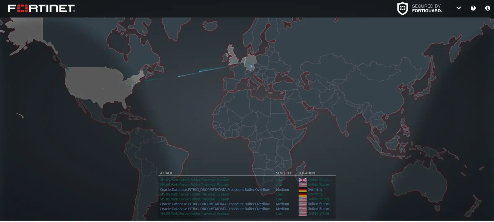 | 6. Fortinet Threat Map | 1. Real-time threat visualization 2. Geolocation of threats 3. Threat intelligence integration 4. Different threat categories |