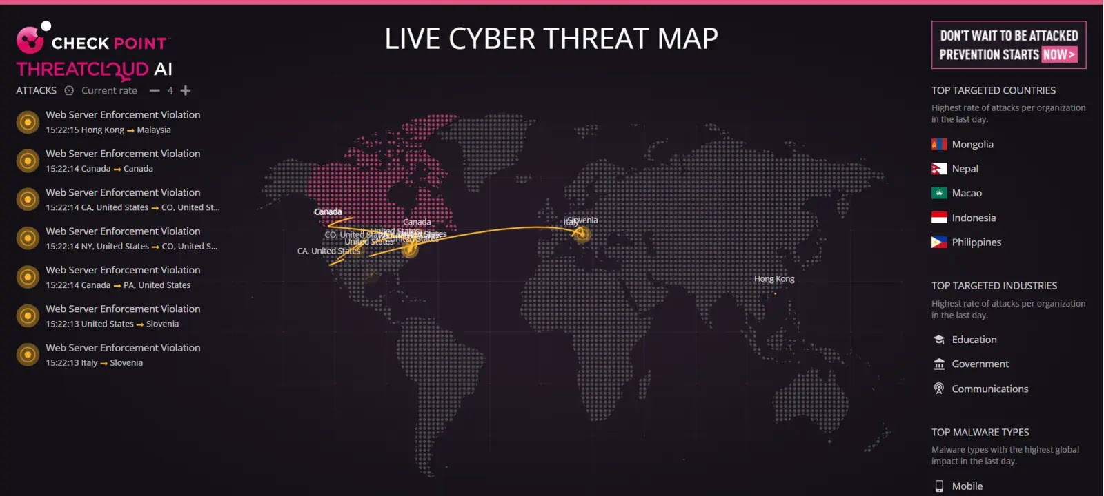 Here we have the Checkpoint Cyber Attack Map, one of the maps that contributes to Checkpoint Software’s ThreatCloud cyber attack map.