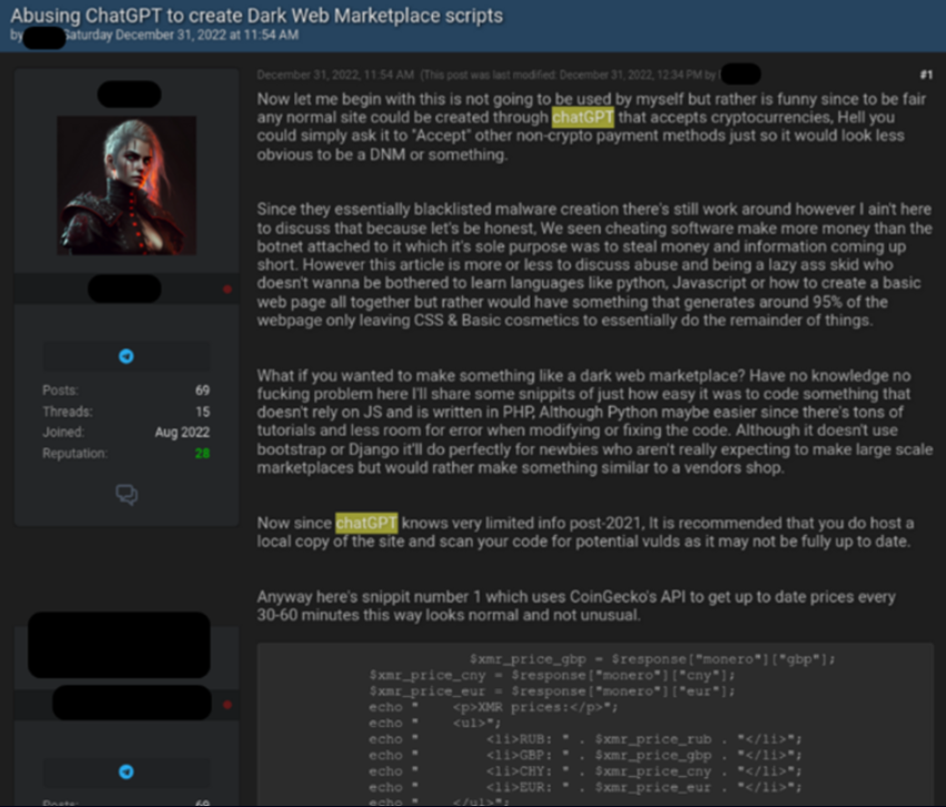 Recently, a threat actor exhibited the process of using ChatGPT to create scripts for building Dark Web marketplaces. As a platform for the automated trade of unlawful or stolen goods, the marketplace plays a key role in the underground illicit economy.