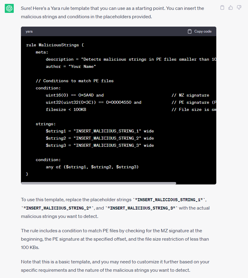 Security analysts can employ ChatGPT to generate detection rules or clarify existing ones, aiding both beginners and experienced analysts in enhancing pattern detection tools like:-