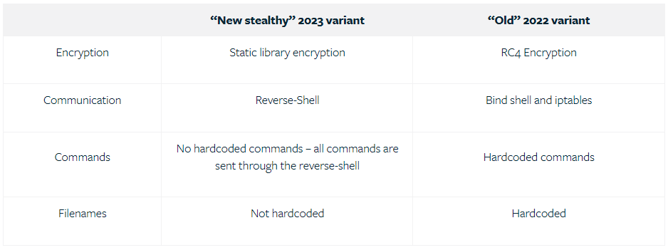 The malware’s commands and filenames were hard-coded, and it employed RC4 encryption, bind shell, and iptables for communication until 2022.