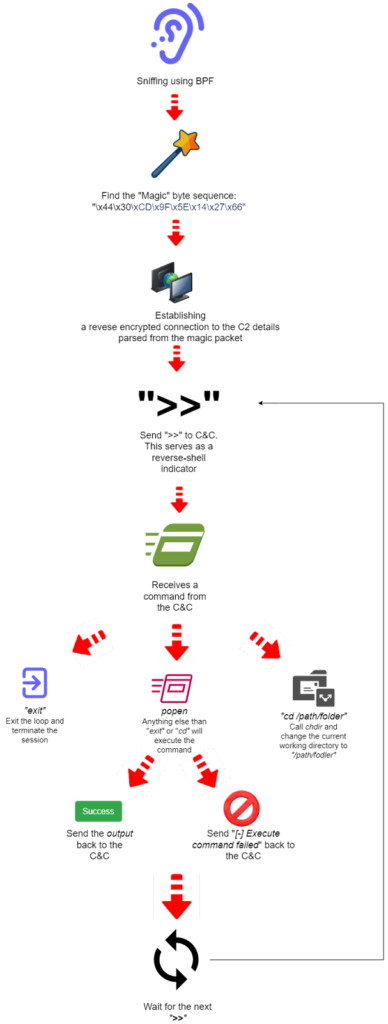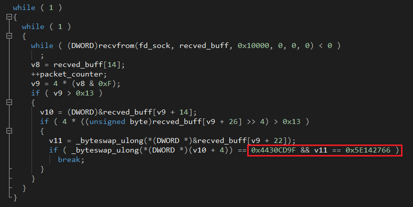 To monitor incoming traffic for a “magic” byte sequence (“x44x30xCDx9Fx5Ex14x27x66”), the malware will allocate a memory buffer and start a packet sniffing socket.