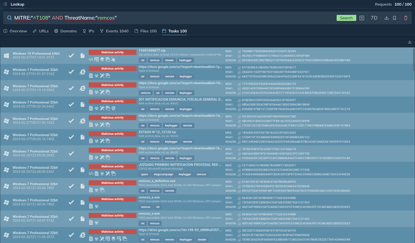 The platform provides a hundred different samples of Remcos, as well as related events where MITRE techniques starting with “T108” were used.