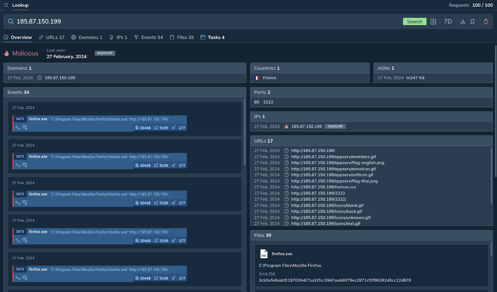 The query in the screenshot above searches for all incidents involving the IP address in question. The platform quickly identifies it as malicious, links to the Asyncrat malware, and provides relevant URLs, files, events, and tasks.