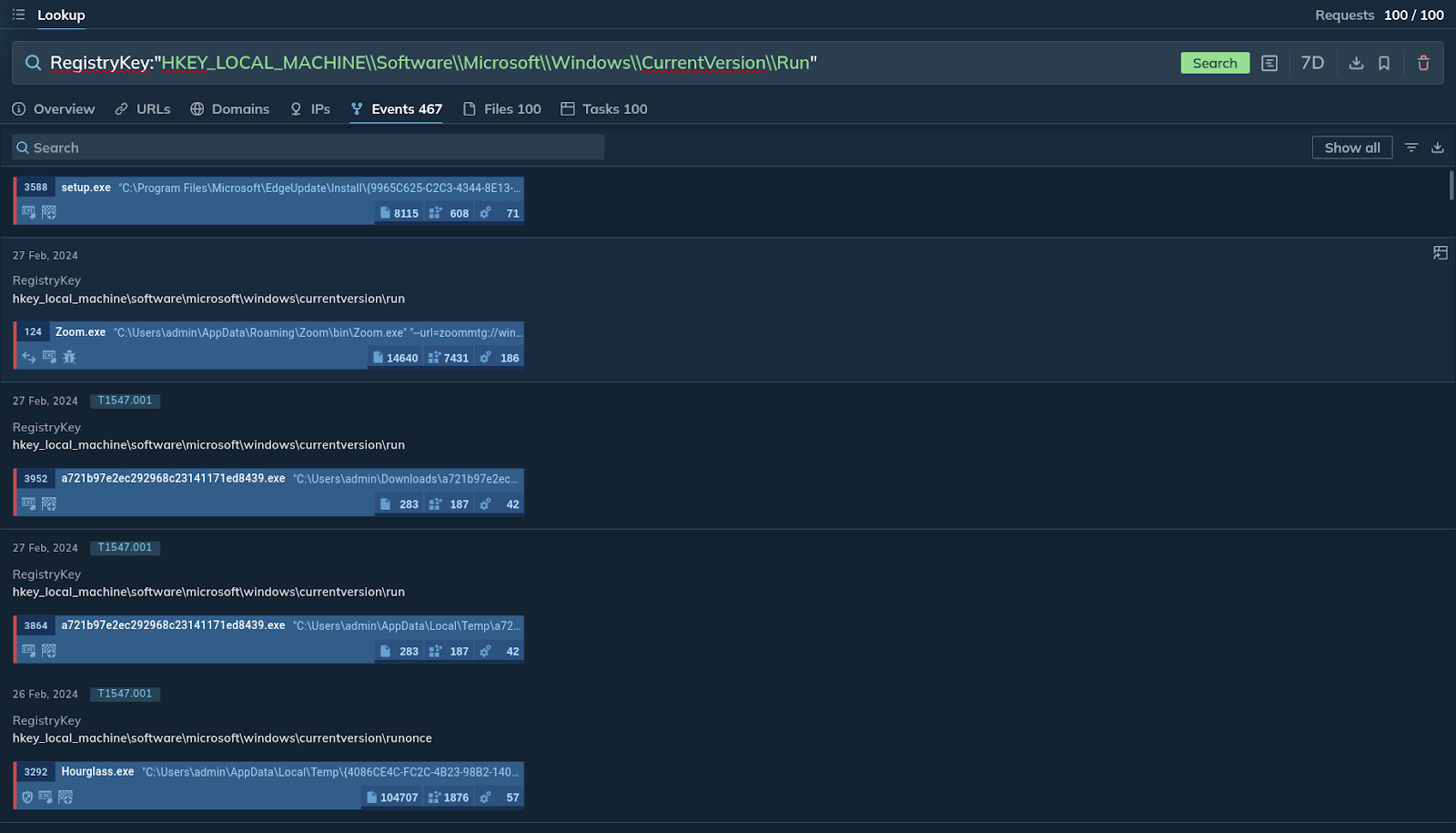 This request searches for any instances of programs or processes configured to run automatically at startup. The platform finds over 400 different events that meet the search criteria.