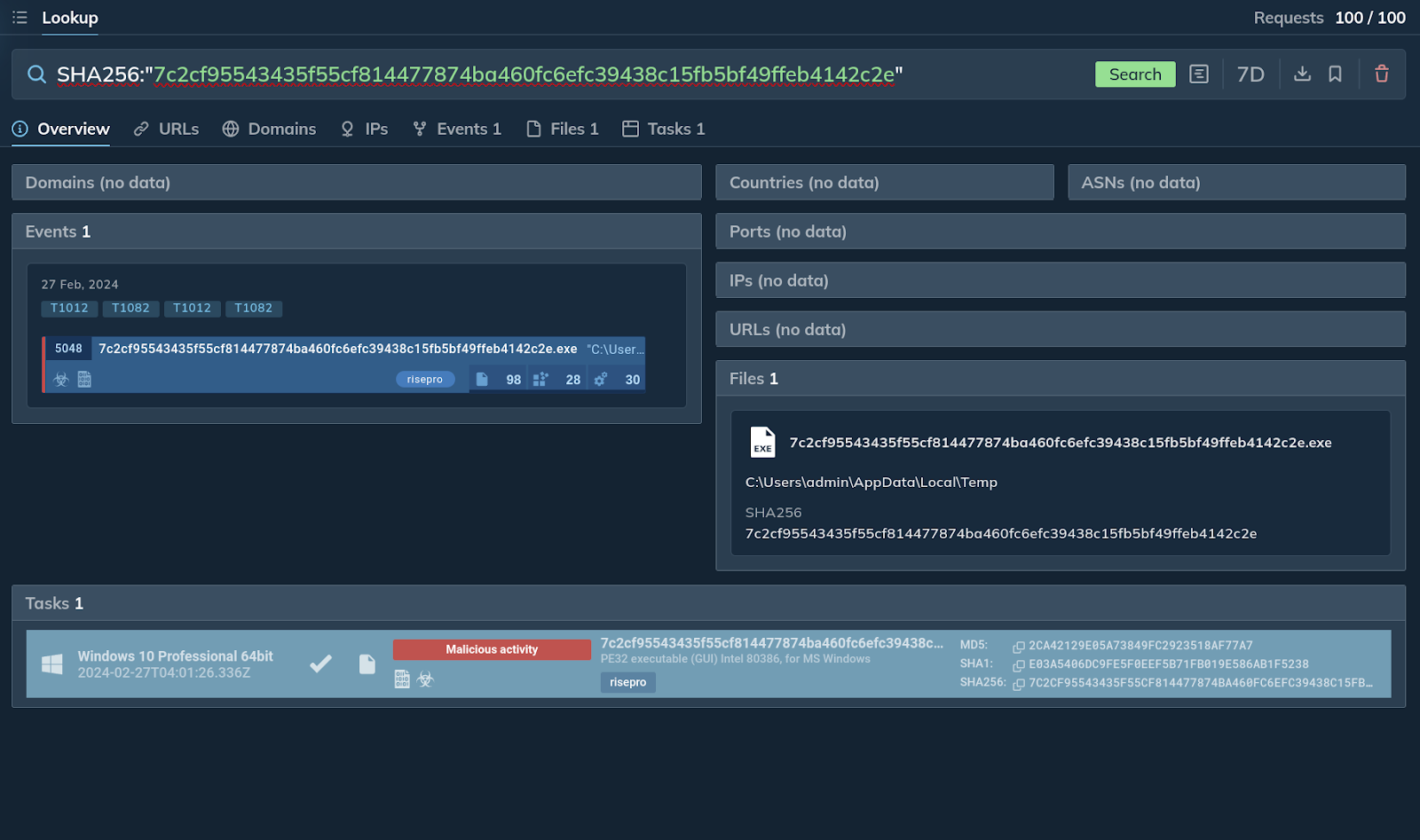 This query searches for all instances where the file with the specific SHA256 hash has been analyzed within the platform. The result shows that this hash belongs to a file associated with the RisePro malware.