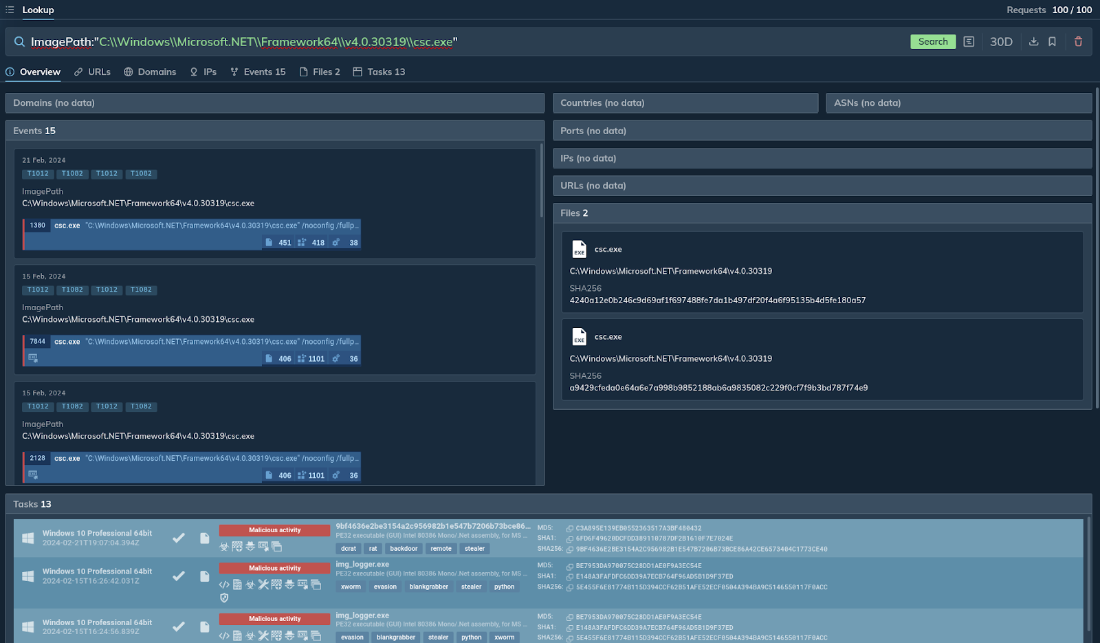 This query searches for instances where the C# compiler is being executed. The platform returns 13 tasks, as well as events and files related to the query.